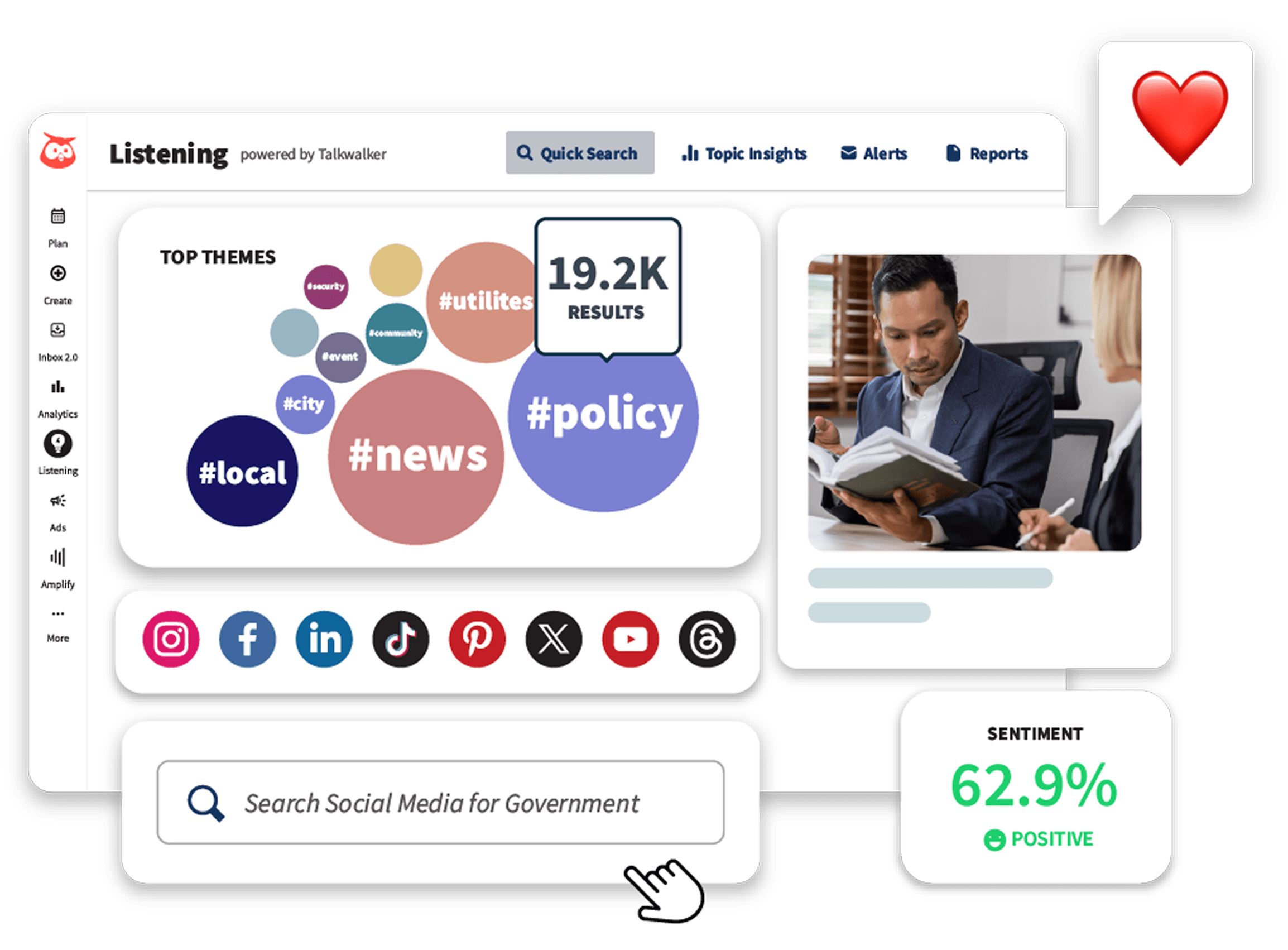 Stay connected to your community by monitoring key conversations and public sentiment in real time. Then, easily create, schedule, and approve engaging posts — all within one secure, compliant workflow.
