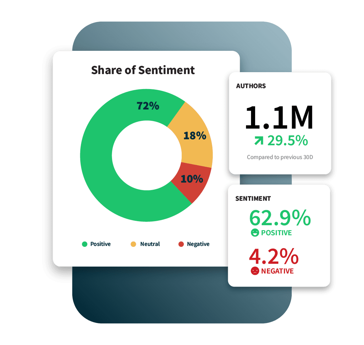 Donut chart showing sentiment analysis: 72% positive (green), 18% neutral (yellow), 10% negative (red), with 29.5% increase over previous period