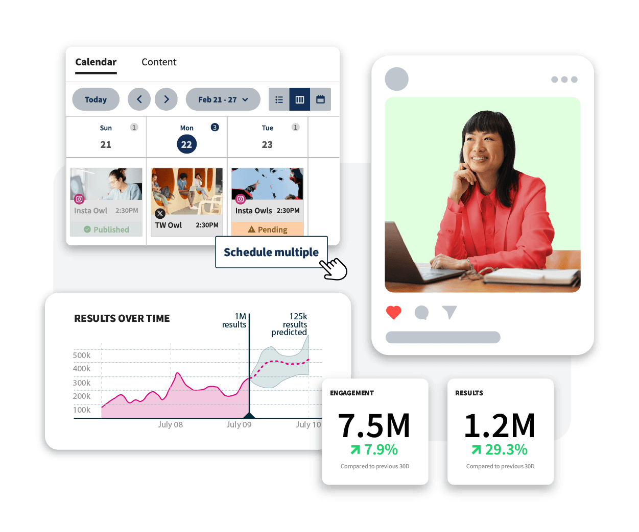 Publica o programa contenido en todas tus redes a la vez con solo unos clics. Descubre exactamente cuándo publicar para obtener la máxima interacción, sube hasta 350 publicaciones a la vez y utiliza la IA para redactar pies de foto y hashtags más rápido que nunca.