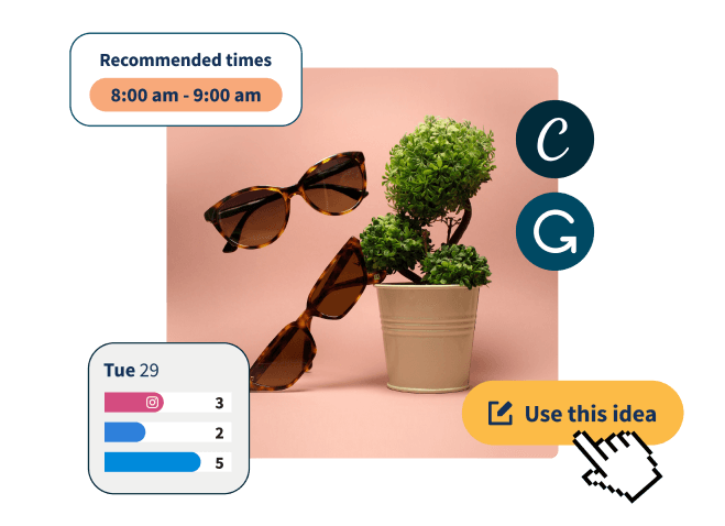 Reduce la semana laboral a la mitad con las mejores herramientas de creación de contenido del sector. Hazlo rápido con las plantillas de Canva integradas, un redactor de pies de foto con IA y columnas para descubrir el mejor contenido para compartir.
